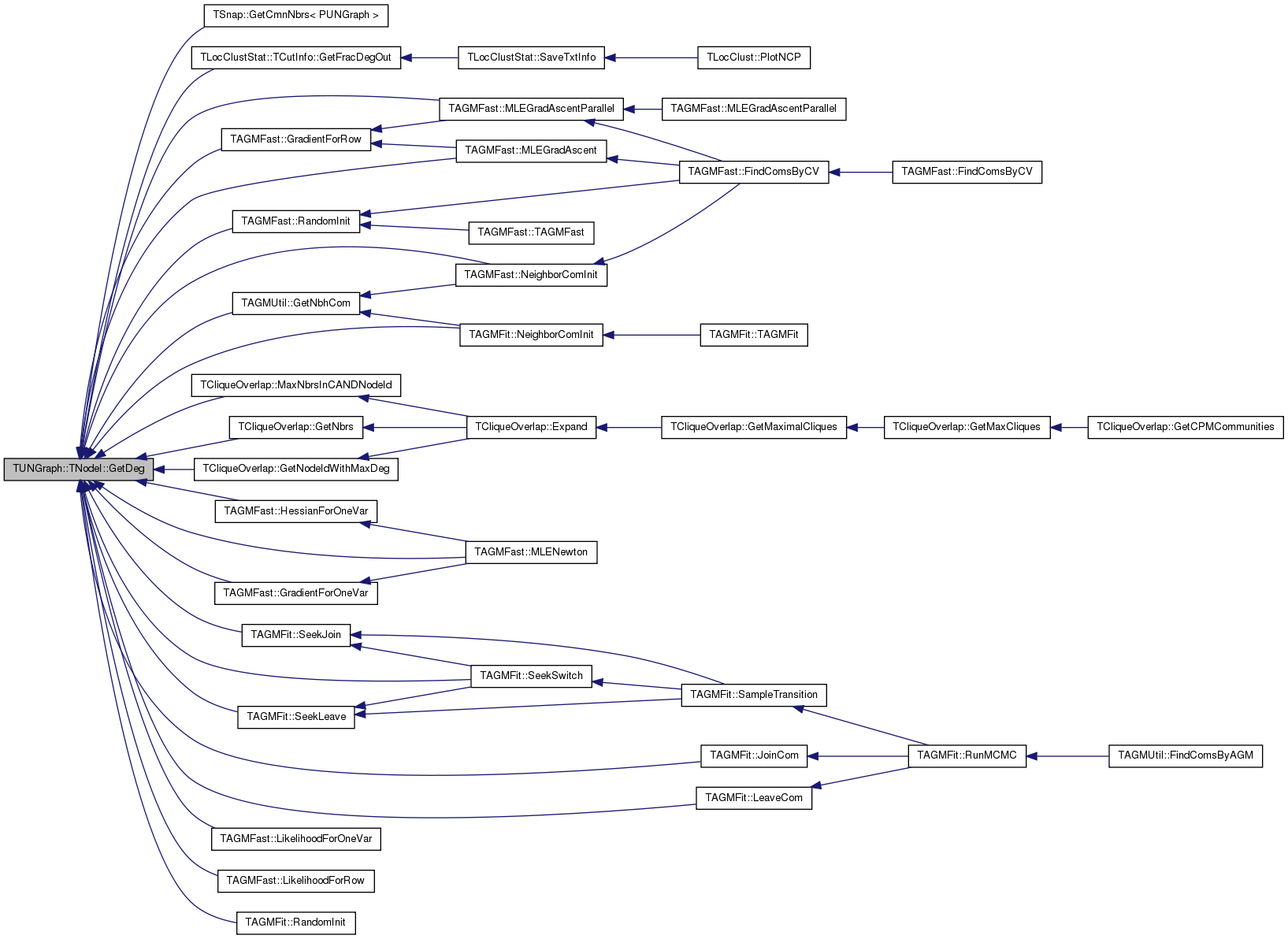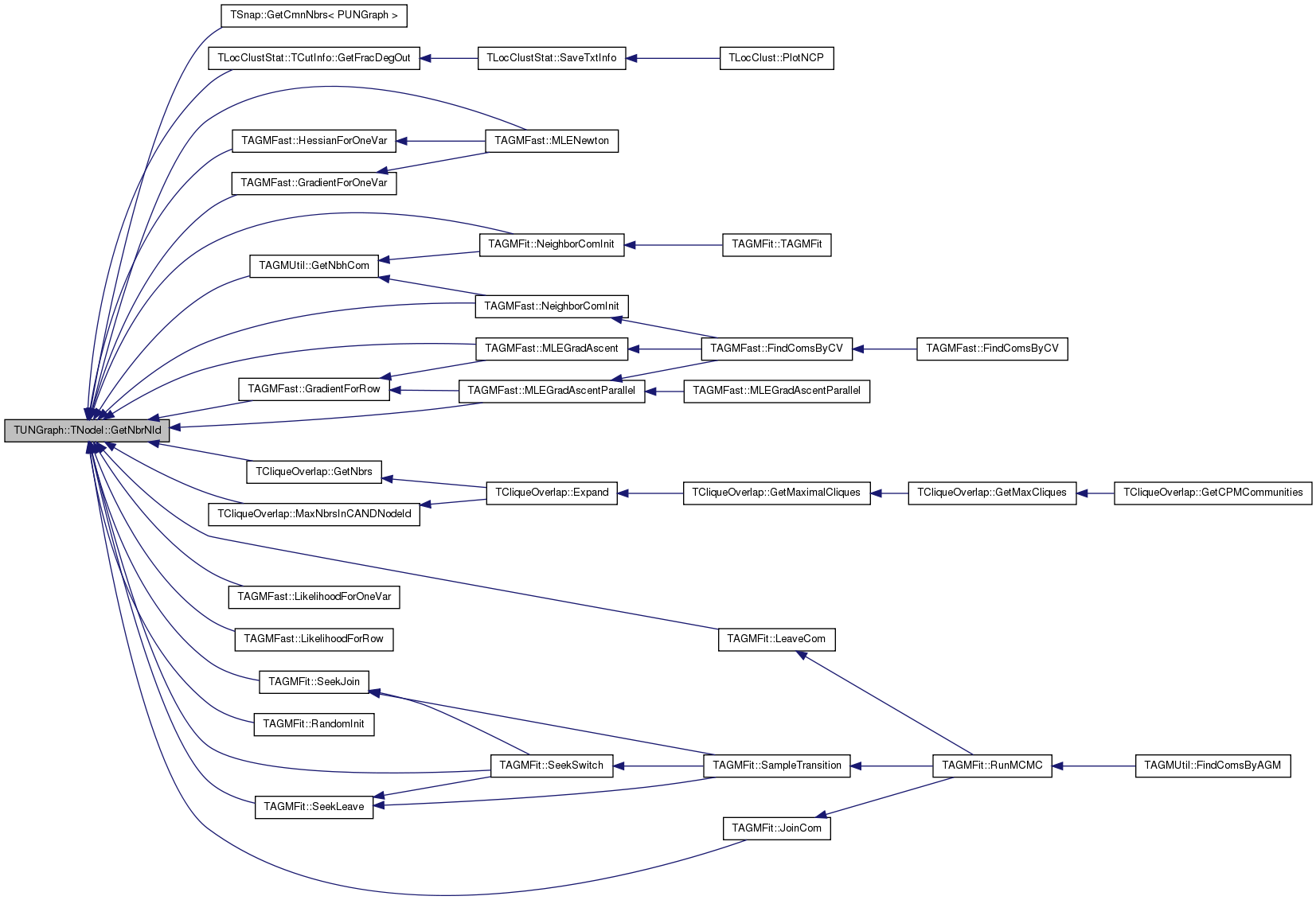 Referenced by TSnap::GetCmnNbrs< PUNGraph >(), TLocClustStat::TCutInfo::GetFracDegOut(), TAGMUtil::GetNbhCom(), TCliqueOverlap::GetNbrs(), TCliqueOverlap::GetNodeIdWithMaxDeg(), TAGMFast::GradientForOneVar(), TAGMFast::GradientForRow(), TAGMFast::HessianForOneVar(), TAGMFit::JoinCom(), TAGMFit::LeaveCom(), TAGMFast::LikelihoodForOneVar(), TAGMFast::LikelihoodForRow(), TCliqueOverlap::MaxNbrsInCANDNodeId(), TAGMFast::MLEGradAscent(), TAGMFast::MLEGradAscentParallel(), TAGMFast::MLENewton(), TAGMFast::NeighborComInit(), TAGMFit::NeighborComInit(), TAGMFast::RandomInit(), TAGMFit::RandomInit(), TAGMFit::SeekJoin(), TAGMFit::SeekLeave(), and TAGMFit::SeekSwitch().