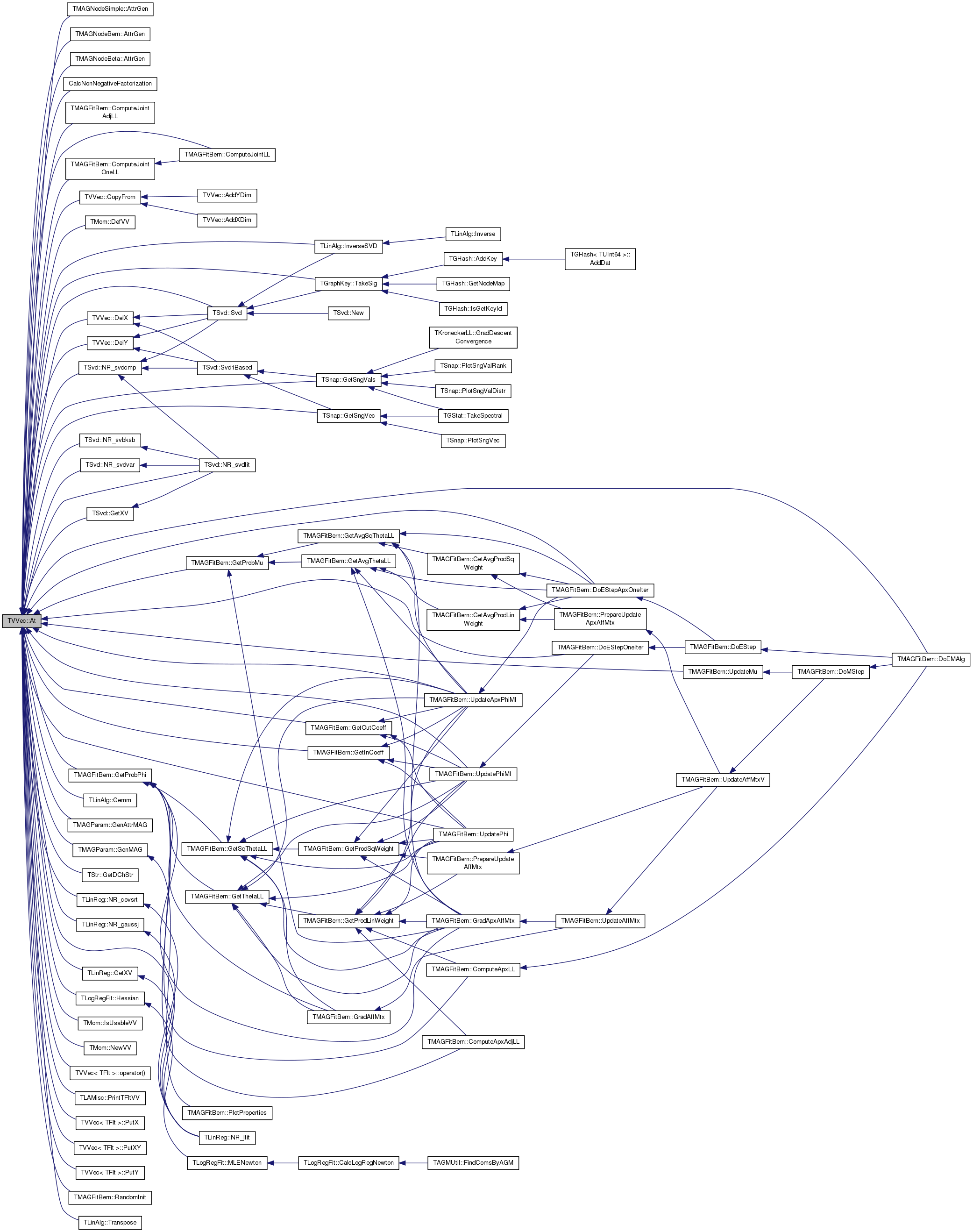 Referenced by TMAGNodeSimple::AttrGen(), TMAGNodeBern::AttrGen(), TMAGNodeBeta::AttrGen(), CalcNonNegativeFactorization(), TMAGFitBern::ComputeJointAdjLL(), TMAGFitBern::ComputeJointLL(), TMAGFitBern::ComputeJointOneLL(), TVVec< TVal, TSizeTy >::CopyFrom(), TMom::DefVV(), TVVec< TVal, TSizeTy >::DelX(), TVVec< TVal, TSizeTy >::DelY(), TMAGFitBern::DoEMAlg(), TMAGFitBern::DoEStepApxOneIter(), TMAGFitBern::DoEStepOneIter(), TLinAlg::Gemm(), TMAGParam< TNodeAttr >::GenAttrMAG(), TMAGParam< TNodeAttr >::GenMAG(), TStr::GetDChStr(), TMAGFitBern::GetInCoeff(), TMAGFitBern::GetOutCoeff(), TMAGFitBern::GetProbMu(), TMAGFitBern::GetProbPhi(), TSnap::GetSngVals(), TSnap::GetSngVec(), TLinReg::GetXV(), TSvd::GetXV(), TLogRegFit::Hessian(), TLinAlg::InverseSVD(), TMom::IsUsableVV(), TMom::NewVV(), TLinReg::NR_covsrt(), TLinReg::NR_gaussj(), TLinReg::NR_lfit(), TSvd::NR_svbksb(), TSvd::NR_svdcmp(), TSvd::NR_svdfit(), TSvd::NR_svdvar(), TVVec< TFlt >::operator()(), TLAMisc::PrintTFltVV(), TVVec< TFlt >::PutX(), TVVec< TFlt >::PutXY(), TVVec< TFlt >::PutY(), TMAGFitBern::RandomInit(), TSvd::Svd(), TGraphKey::TakeSig(), TLinAlg::Transpose(), TMAGFitBern::UpdateApxPhiMI(), TMAGFitBern::UpdateMu(), TMAGFitBern::UpdatePhi(), and TMAGFitBern::UpdatePhiMI().